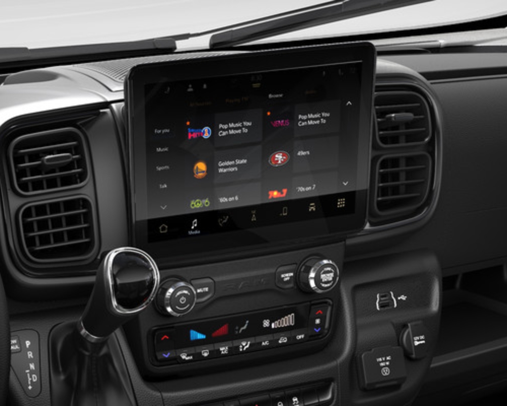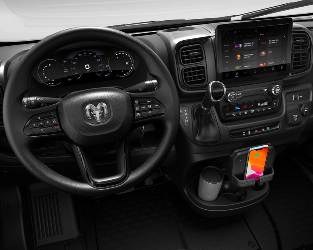 Inside, the 2025 ProMaster has been updated with modern technology and smart design touches that make every drive more comfortable and productive. The new Uconnect® 5 system comes standard with a 10.1-inch touchscreen, offering wireless Apple CarPlay® and Android Auto™ compatibility. Navigation, voice control, and real-time traffic updates help you stay connected and on schedule. Driver comfort is a priority too, with available options like heated seats, a heated steering wheel, and a 12-way power driver’s seat with lumbar support. These small touches can make a big difference for those spending long hours on the road.